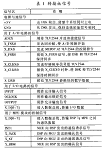 DSK提供了存储器接口和外围设备接口两列扩展接口。根据"灰箱法"的设计思想,不用完全理解DSK的内部原理,只需在对其整体有一个基本了解的基础上,选择可能要用到的信号即可。因此专门设计了一块转接板,作为外围电路与DSK之间通讯的桥梁。从DSK中引出了26个信号,如表1所示。