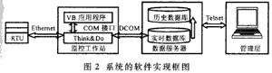 本系统通过运行于监控工作站的Think&Do应用软件,以50ms的扫描速率对所有I/O数据进行刷新并将所有数据分类保存在文本文件(.TXT)中。同时,利用Think&Do开发出良好的人机界面,用以显示实时数据和控制设备;利用它的RUN模块可运行外部可执行文件(.EXE)的功能,用VB开发一些产生特殊报表和界面的程序(例如示功图的绘制程序),以满足用户的需要。VB和Think&Do之间的实时数据交换是通过COM组件实现的。监控工作站上的原始数据通过100M以太网及时传送给数据服务器以备上一级查询,它们之间可通过DCOM标准接口或Think&Do的TnDNTag控件进行实时数据通信。数据服务器和厂部及作业区之间采用C1ient/Server模式,通过VB开发的远程登陆程序,可实现对数据的查询或下达调控指令。