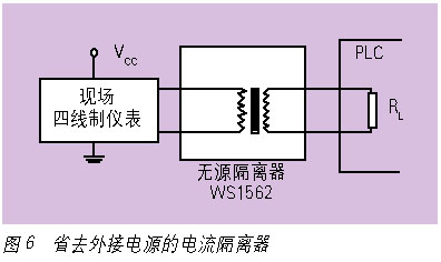 一般4~20mA电流信号隔离器需要外接工作电源。这里推荐一种不用另外再加电源的隔离器WS1562。如图6。WS1562的最大特点是无需外接电源,接线简捷、功耗低、可靠性能高,多路连接符合上述两个原则。