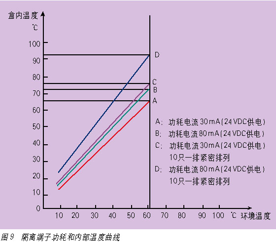 功耗是指隔离端子工作时消耗的电能,它和产品的内部热量温度有关。图9给出两种具有不同功耗的隔离端子按2种排列方式:独立放置、10只一排紧密排列条件下,内部温度和环境温度(产品说明书上称为:工作温度)的关系曲线。