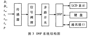 在线监测仪以DSP为核心,实时采集各有关参数,计算出污脏系数并作动态显示。其硬件结构如图3所示。