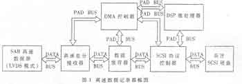 整个系统的设计总体框图如图1所示,包括高速数据源、高速差分接收器、DMA控制器、数据缓存器、DSP微处理器、SCSI协议控制器和高速SCSI硬盘等子系统;下面分别给出各子系统的设计(PAD BUS表示控制信号线,DATA BUS表示数据信号线)。