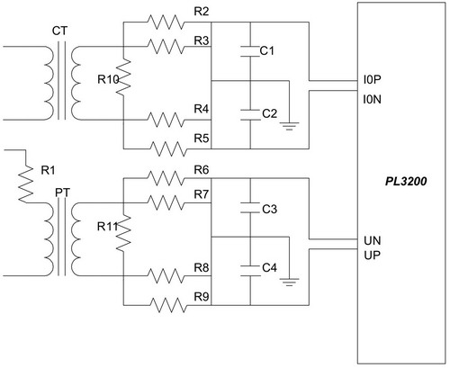 其工作原理是:首先,通过电流互感器CT、电压互感器PT对电流、电压采样,采样电路如图3;采样后经过放大电路放大,通过A/D 转换器转换成为数字信号;接下来经过数字滤波、移相等处理;最终,得到有效的电能计量数据。从而,完成对有功/无功功率、瞬时电流和电压的有效值以及当前的交流频率值的计量,计算。