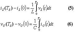 在稳定状态下,电感器电流和电容器电压在一个开关周期内的净变化必须为零,因此[等式 5] 和[等式 6] 变为: