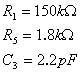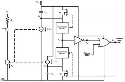 工作周期调制的理想状态是通过调制流入频率插针的直流电流,在接通时间内减慢振荡器,在断开时间内加速振荡器。 在开关和频率插针之前连接的 和 系列的行为类似直流电来源: 当开关接通时,它从频率插针中排泄电荷,而当开关断开时,它将其它电荷注入同一个插针。 两个方向的电荷传递的时间常量如下: