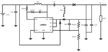 提供了美国国家半导体公司的 LM2623 稳压器的 SEPIC 设计示例。 如果负载在一段范围内不变化,可以通过外部分量修复开关频率并允许工作周期随输入变化而变化。 这样,转换器的行为类似于典型的 PWM 调制转换器,该转换器的差别就是无需任何补偿,因为 PFM 体系结构非常稳定。