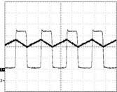 图 10: Vg=3.0V 时 L1 开关信号的电流波形。 1) VSW, 2V/div, DC; 2) 电感器电流,100mA/div, DC; T= ns/div