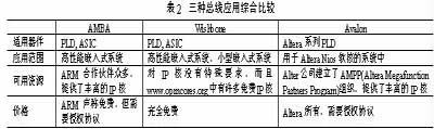 三种总线各有特点,决定了其应用范围的不同。AMBA 总线规范拥有众多第三方支持,被ARM公司90%以上的合作伙伴采用,已成为广泛支持的现有互连标准之一。Wishbone异军突起,其简单性和灵活性受到广大SoC设计者的青睐。由于它是完全免费的,并有丰富的免费IP核资源,因此它有可能成为未来的片上系统总线互连标准。Avalon主要用于Altera公司系列PLD中,最大的优点在于其配置的简单性,可由EDA工具快速生成,受PLD厂商巨头Altera极力推荐,其影响范围也不可忽视。