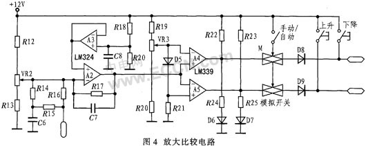 2.2 放大比较电路 放大比较电路如图4所示。来自电容传感器电路的变化直流信号送入A2放大器放大,A2的正端电压通过A3被R18和R20分压,A2的反向端直接接至VR2电位器中点,调节VR2电位器中点可改变A2反向端的电位,也就是改变A2的输出电压。来自电容传感器电路的变化直流信号电压和VR2电位器中点的直流电压叠加到A2的反向端,通过A2线性放大后,A2输出变化的直流电压,调节电位器VR2中点电压实际就是改变电容探头离钢板的实际探测距离。A2输出电压一路接A4的正向输入端,另一路接A5的反向输入端,调节VR3电位器中点电压,可同时改变A4的反向电压和A5的正向电压,D5起箝位电压作用。当A2输出电压跌落至D5箝位电压时,A4和A5之间无输出电压。当A2输出电压大于A4反向端电压时,A4输出高电平,D6发光二极管点亮;当A2输出电压小于A5正向输出电压时,A5输出高电平,D7发光二极管点亮,指示电容探头升高或降低。当手动/自动开关闭合时,A4和A5的电压能通过模拟开关M传输到D8和D9,以驱动后续的光耦电路。在自动状态下也可以进行手动上下调节,手动上下调节比自动上下调节优先级高,所以在实际工作现场,处于自动状态时如果遇到紧急状态,可以手动人工紧急干预,按上升键或下降键,以免碰到钢板或障碍物造成事故发生。