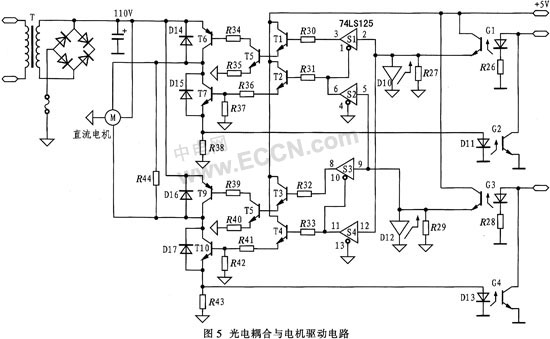 光电耦合与电机驱动电路如图5所示。来自放大比较电路的高低调节信号通过光耦G1和G3送到功率驱动电路,光耦的作用是把电机驱动电路与放大比较电路隔离,将强电与弱电分离。这样电机干扰和现场干扰就不会进入放大比较电路。