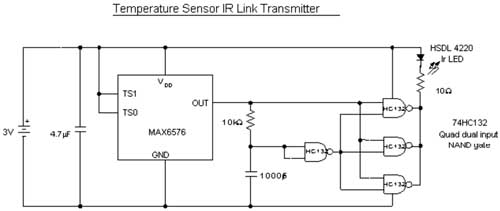 图1 IR发射器,用温度—周期转换器(MAX6576)为每个正向转换产生一个短的10 s IR脉冲