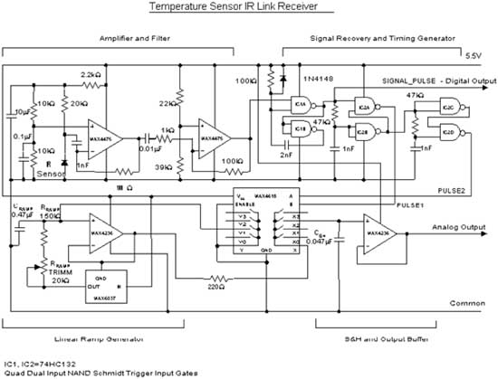 因为恢复输入信号(SIGNAL-PULSE)的周期正比于远程传感器处的温度,所以,在第2个SIGNAL-PULSE到达时,所呈现的斜波电压也是正比于温度。由S&H电路存储的电压形成到3个有效数字的稳定模拟输出。强烈环境光照IR链路的范围大约为20英尺。