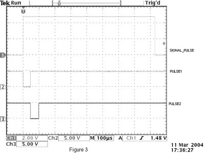 一个史密特触发器单元和2个级连数字差分器执行信号恢复和定时。图3的示波器波形示出~1ms恢复脉冲(SIGNAL-PULSE,也是数字输出)和由SIGNAL-PULSE触发的两个时序50 s脉冲(PULSE 1和PULSE 2)。