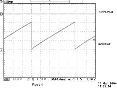 由电阻器RRAMP和自举基准电路充电电容器CRAMP提供恒流产生线性斜波(图4)。由自举基准IC的同一运放缓冲斜波。因为斜波斜率是电容器数值和流经电阻器电流的函数,所以,电阻器、电容器的容差和基准电压对所需的调节产生影响。用与RRAMP串联的电位器可调节模拟温度读出的精度。