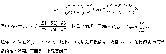 ADS7864模拟输入通道的+IN和-IN的最大电压输入范围为-0.3V~+5.3V(ADS7864 +5V供电)。图3的电路中使用了2个运放,A1用作跟随器,用来缓冲ADS7864输出的2.5V基准电压源;A2和四个电阻构成了信号调理网络,适当配置R1~R4电阻可以实现对输入信号Vi的缩放和平移以适合ADS7864模拟通道的输入要求。+IN端的输入电压表示如下: