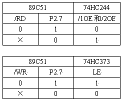 系统采用89C51的P2.7寻址ADS7864,地址为8000H,同时用这个地址信号配合89C51的/WR和/RD信号作74HC244和74HC373的使能信号。要求当89C51的/RD=0,P2.7=1时才开启74HC244,读取ADS7864的转换结果;当89C51的/WR=0,P2.7=1时74HC373才锁存89C51 P0口上的数据信号,实现往ADS7864的控制端写数据,其它时候74HC244和74HC373都是关闭的,这样避免了89C51 P0口上的其它信号对ADS7864的干扰。采用锁存器74HC373来连接89C51和ADS7864的原因是为了在ADS7864转换数据的时候保持/HOLDA~/HOLDC、A0~A2端的电平保持不变,免得影响ADS7864转换数据的精度。74HC244和74HC373的使能信号真值表如下: