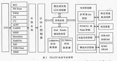 (3)PXA255工作电压是1.3V,而PXA250工作电压是1.5V,PXA255功耗更小,节约了电能。采用0.18μm制造工艺,是一块面积为17mm×l7mm、256脚的芯片。