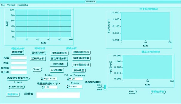 便携式PC机上的软件Lab Windows/CVI,具有用户界面简洁明了,数据采集软件操作简单及数据处理软件功能强大的优点。软件在Windows操作系统下运行,打开可执行文件之后,在便携式PC机上,显示出用户操作界面,用户要进行各种数据分析,只需要点击相应的按钮即可。软件上不仅显示了试验的实时数据,还可以进行数据回放。数据的接受,存储,只需要进行响应的按钮和菜单操作即可,操作十分简单。GUI(图形用户界面)见图5。