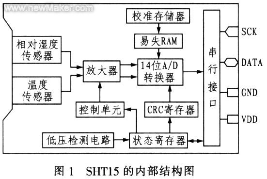 传统弹药仓库的监控系统采用的是干,湿球湿度计、毛发湿度计、湿敏电阻器或由普通的温,湿度传感器组成的监控系统,通常结构比较复杂.系统庞大.准确性差。笔者采用瑞士森斯瑞(Sensirion)公司推出的SHTl5型超小型、自校准、多功能式智能传感器.测量相对湿度、温度和露点等参数,适合弹药仓库温,湿度智能监控系统的设计。