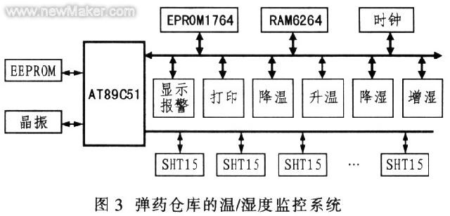 AT89C51和SHT15之间通过串行总线进行通信.执行机构主要由电机控制的降温机、升温机、降湿机、增湿机等组成。弹药仓库的温/湿度监控系统如图3所示。