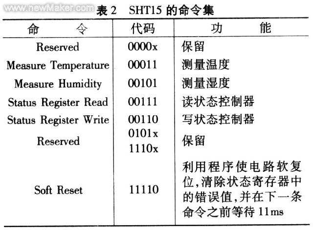 由于SHTl5中含有存储器,所以设置初始化程序主要是对单片机和SHTl5的存储器中的一些数据置初值,同时对单片机的初态进行初始化。该系统是多通道的测量系统.SHTl5上电后经过10ms时间就进入休眠状态,只有当单片机发出测量命令后,SHTl5才被“唤醒”而进行工作,所以.单片机循环对各个传感器发出温,湿度测量命令,实现多通道的温,湿度测量。SHTl5的命令集如表2所列。