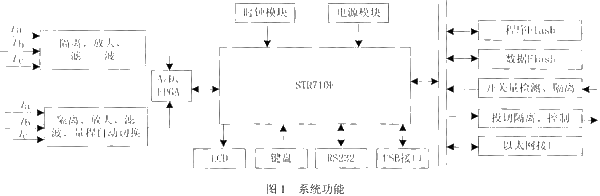 系统的总体结构框图见图1,包括隔离、放大、滤波、量程自动切换、锁相电路、时钟模块、LCD显示、通信、FPGA谐波检测、以态网接口等模块。用交流采样法高速采集经调理后的三相电压、三相电流及通过二次运算计算出零线电流、有功功率、无功功率、频率、功率因数及三相不平衡度等参数,并能检测到21次谐波,对以上数据进行记录保持,并可通过液晶屏观察这些数据。另外,实现多种通信技术,如RS232,CAN总线、以太网通信等。