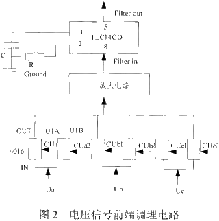 现在以电流信号为例说明该部分的电路设计,电压信号的调理电路与电路信号相似。该部分的电路设计如图2。在正常供电的情况下,通过编写循环子程序对各相模拟开关的控制信号赋值,从而达到对三相信号分时循环采集的目的。对于电流量测量,本系统设计了量程自动切换功能(分两个量程档)。现以A相信号为例,分忻一下如何实现量程自动切换功能。