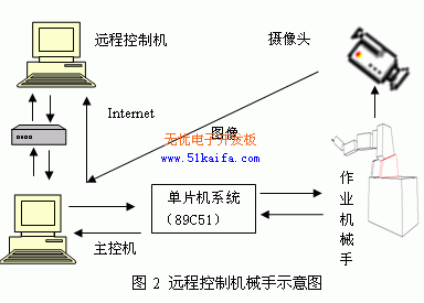 基于web的机械手的远程控制,在高温、水下等恶劣的工作环境下,需要远程控制机械手实行操作。在远程通过浏览器输入操纵数据,通过网络传送给主控机,主控机采用一般的PC机,主控机通过串口把数据发送给下位机,该作业机械手系统中采用89C51单片机作为直接控制计算机。现场通过监控设备把作业机械手的姿态反馈到远程控制机,同时通过传感器采集现场数据返回到控制机。图2为远程控制作业机械手的系统示意图。