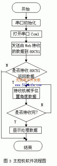 主控机由PC机担任,用VC++开发操纵界面,通过串口控件MSComm对串口通讯协议进行串口初始化,从后台数据库SQLServer中提出从WEB发送的控制机械手的数据,控制机械手各个关节的执行的角度量,同时等待接收89C51回送回来的数据。软件系统的流程图如图3所示。