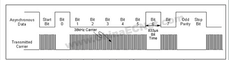 图3. DL/T 645多功能电表标准规定的IR通信示意图。通过调制IR光束发送数据,有信号表示0,无信号则表示1。通信 - 数据包格式