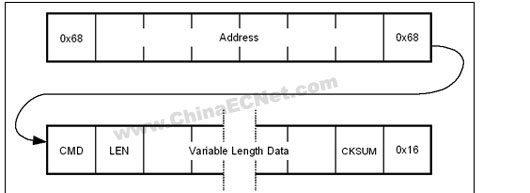 图4. DL/T 645规定的帧格式包括一系列固定域和可变域。该帧格式在IR和RS-485通信模式下是相同的。 该数据包格式有以下几点非常独特,包括: