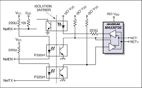 图4. 通过使用一个Maxim的半双工收发器和价格低廉的光耦实现RS-485通信[/td]