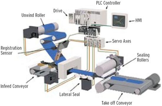 利用PLC和I/O模块、电机驱动控制器和多轴控制器的一个实例是典型的包装应用,这种应用包括一个用于卷绕材料的退绕辊子、一个用于传送需要包装物品的进料装置,以及一些封口位置和一个完成包装后移走物品的传送装置。