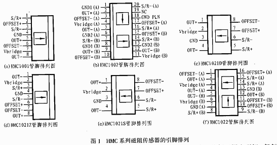 ●集成度高,片内集成了霍尼威尔公司取得专利的置位/复位技术,因而可以减少温度漂移、非线性及在高磁场环境中对输出信号造成的影响。而片内偏置电路则可消除磁场失真的影响。HMC系列磁阻传感器的主要型号如表1所列,图1所示是其中6种型号的引脚排列和定义。