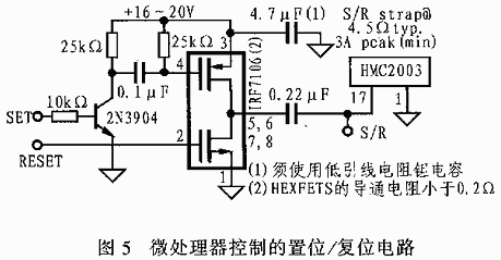 图5是一种可在微处理器的控制下产生大于4A的置位/复位强脉冲电路图。利用该电路可在微处理器的控制下产生置位和复位信号以控制HEXFET驱动器(IRF706)的P和N通道。引入TRS和TSR延时的目的是确保在一个HEXFET开通之前使另 个HEXFET闭合,这类似一个先开后保的开关接点。利用这一开关可在4.7μF电容和脉冲输出点之间串接一个500Ω的分压电阻。如果不使用微处理器,也可用时钟信号来触发置位和复位信号。