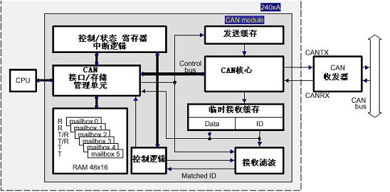 LF2407A芯片内嵌CAN控制模块,集成了一个全CAN功能的16位控制芯片,且与CAN2.0B协议完全兼容,支持标准格式和扩展格式。LF2407A的CAN模块包含两大部分:CAN控制/状态寄存器和CAN邮箱RAM区。其结构框图如下: