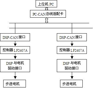 其系统结构主要可分为三层:第一层、PC机与CAN总线接口层----实现PC机与CAN通讯总线之间的可视化操作控制,以PC-CAN----智能型CAN总线通讯适配卡实现;第二层、CAN总线与DSP控制器LF2407接口层----实现CAN总线和LF2407-A板的CAN控制器的物理接口和通讯;第三层、LF2407的I/O口与步进电机的驱动接口----实现对LF2407-A板的电气隔离保护和步进电机的大电流驱动,完成电机的实际动作。