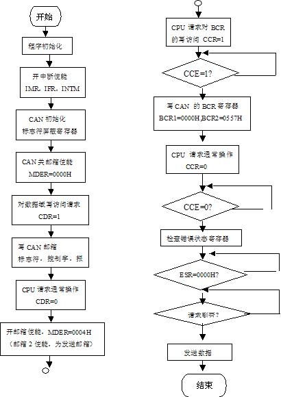主要分为:1、电机控制系统整体---实现系统初始化,并生成电机控制频率信号,以中断方式实现电机控制字的修改,延时子程序实现电机的转速控制,初始化CAN模块。2、CAN 发送一个远程帧请求-----初始化CAN请求帧,令CAN邮箱3为发送请求帧邮箱,CAN邮箱0为接收数据帧邮箱。邮箱3发送一个请求帧请求电机控制字数据,当查询到接收报文标志位为1时(RMP=1),邮箱0接收数据。3、CAN 初始化一个自动回答远程帧请求----初始化CAN自动回答远程帧请求,令CAN邮箱3为发送邮箱。当接受到一个远程请求时,发送一帧数据。以下以CAN 初始化一个自动回答远程帧请求为例给出软件程序流程图,见图6。