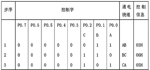 由表1可知,正反转所需要的信息串为03H→06H→05H→03H,这时按AB→BC→CA→AB顺序通电。反转时所需的信息串为05H→06H→03H→05H,这是按照顺序CA→BC→AB→CA通电。