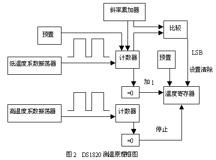 DS1820的温度测量原理如下:DS1820测量温度时使用特有的温度测量技术,其测量电路框图如图2所示。内部计数器对一个受温度影响的振荡器的脉冲计数,低温时振荡器的脉冲可以通过门电路,而当到达某一设置高温时,振荡器的脉冲无法通过门电路。计数器设置为-55℃时的值,如果计数器到达0之前,门电路未关闭,则温度寄存器的值将增加,这表示当前温度高于-55℃。同时,计数器复位在当前温度值上,电路对振荡器的温度系数进行补偿,计数器重新开始计数直到回零。如果门电路仍然未关闭,则重复以上过程。温度表示值为9bit,高位为符号位。
