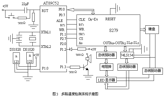 本设计中以DS1820为传感器、AT89C52单片机为控制核心组成的多点温度测试系统如图3所示。用6只DS1820同时测控6路温度(视实际需要还可扩展通道数)。89C52单片机P1.1口接单线总线。DS1820采用寄生电源供电方式。为保证在有效的DS1820时钟周期内能提供足够的电流,图3中采用一个MOSFET管和89C52的H.0口来完成对DS1820的总线上拉。键盘扫描和动态扫描的显示共用一片可编程接口芯片8279,显示采用8位共阴极LED数码管,它可用来显示通道数、温度测量值以及TH、TL的值。