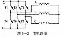 系统采用的控制方式为二相导通三相六状态,主电路如图3—2所示。功率器件的排列顺序采用图中所示的上桥臂1,3,5,下桥臂,4,6,2的顺序。按照一定的逻辑关系打开6个功率器件,即可实现电机的正反转。根据磁极位置传感器的信号组合,有6种状态,一一对应于桥臂的开关组合,如从T1, T2→T2,T3→T4,T5→T5,T6→T6,T1→T1,T2,如此循环,反过来即可实现反转。