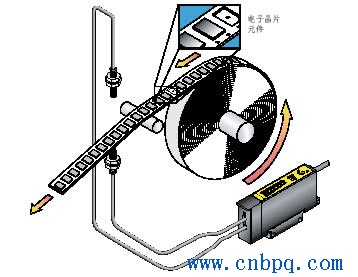 应用举例说明:表面贴装电子元件馐在塑料卷轴中,当元件到位时,遮挡对射式光束,当元件丢失时,对射式光束穿透塑料包装,传感器发出报警信号。