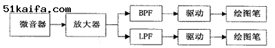 在图2的结构中,微音器捡拾由炮枪发出并经过井管接头和油层表面反射后返回到井口的低频声波信号,该信号经放大器放大后进入两个窄带滤波器:带通滤波器 BPF和低通滤波器LPF。带通滤波器的输出即为节箍波信号,低通滤波器的输出为液面波信号。数据采集由驱动电路控制绘图笔在纸带上绘制节箍波和液面波曲线来完成。井口位置、液面位置、参考节箍波起点、参考节箍波终点等特征位置的提取及动液面深度与井管内平均声速的计算完全由技术人员手工完成。