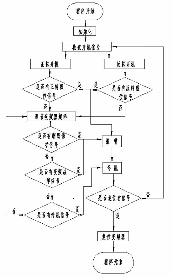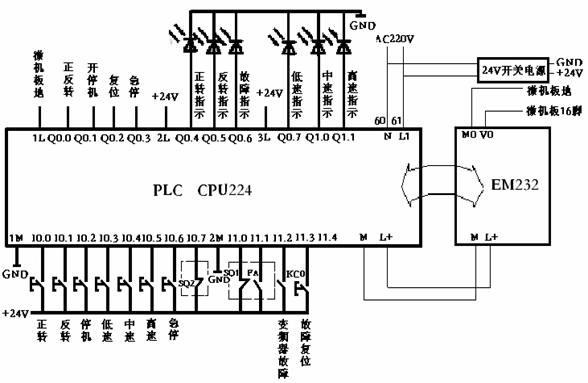 用户通过操作台发出各种指令,经过 PLC 处理后,给出开停机等各种动作信号。由模拟量模块 EM232 接受 CPU224 发出的指令,给出模拟电压信号控制变频器的频率高低,进而控制调度绞车电机的速度大小。
