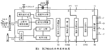 TC790A的电路原理是以三相电的其中一相经变压器降压后作为A同步电压,然后通过电阻网络进入电路的18脚,其同步电压峰值不大于电源电压,同步电压可通过零检测和极性判别电路检测出零点和极性。图1所示是TC790A的内部原理框图。