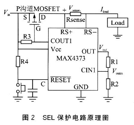 如图2所示,Vin是负载电路的电源,同时也是MAX4373的电源。上电后,经电流检测电阻Rsense后向负载Load供电。负载电流Iload经Rsense,在其两端产生一个电压降Vsense。它作为电流检测信号输入MAX4373中的电流检测放大器,其固定增益为Av,则放大后的电压信号由0UT端输出,Uout=Vsense×Av。R1、R2组成电压分压器,它将Vout经分压后输入内部的电压比较器同相端CINl,与反相端(接内部O.6 V基准电压)相比较。若流入负载电路的电流未超过设定的阈值电流,则电流检测放大器输出的电压Vout经R1、R2分压后Voutin小于0.6V,内部电压比较器输出低电平(从COUTl),P沟道MOSFET导通,即负载的供电电路连通;若流入负载电路的电流超过了设定的阈值电流,则由Rsense检测的电压经电流检测放大器放大后,使输出电压Vout经R1、R2分压后Voutin大于0.6 V,内部电压比较器翻转,COUTl输出高电平,使P淘道MOSFET截止,于是负载的供电电路被切断。内部电压比较器为输出锁存型,一旦翻转,则输出高电平锁存,电路断开状态保持,即负载保持断电。大电流消失后,按一下复位按钮(>2μs),内部电压比较器复位,COUTl输出低电平,MOSFET导通,负载加电重新工作。图2中的R3即为COUTl输出上拉电阻,同时也提供了P淘道MOSFET的VGS电压.抑制流经MOSFET的电流。