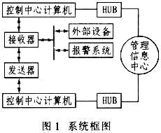 电子收费系统主要由无线发射器、无线接收器及管理信息中心三部分组成,如图1所示,系统设计中选用移动的车辆安装接收器,因为如果将车辆作为发射器,那么由于发射的信息与接收器将要反馈的信息内容极为相似,飞机容易出现信息的相互冲突与无法确切辨认的矛盾,考虑到每辆车实际获得的信息是相同的,故灵活地采用固定物安装发射器,将发射器固定在道路两旁,循环发射相同信息,当安装在车辆上的接收器进入发射器的有效感应区内时,接收器接收发射器的信号,并做相应的处理后存储数据,同时,通过监控程序判断是否需要报警提醒;发射器与接收器还可以通过计算机与管理信息中心通信,中心统一调整发射器的收费信息,接收器配合中心进行实际货币结算,同时更新数据以备用户查询和中心统筹管理。