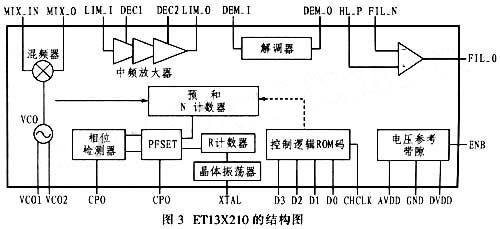 ET13X221型发射器内集成了锁相环、频道选择器和发射缓存器。ET13X210型接收器集成了锁相环、混频器、中频放大器、滤波器、解调器和频道选择器,其结构图分别如图2和图3所示,该电路具有如下特点: