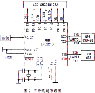 手持终端以LPC2210为主控制器,LPC2210是基于实时仿真和跟踪的16/32位ARM7TDMI-SCPU的微控制器,并带有256 KB的嵌入高速Flash存储器;128位宽度的存储器接口和独特的加速结构,使32位代码能够在最大时钟速率下运行[1]。由于内置了宽范围的串行通信接口,从而给硬件设计和软件移植都带来了很大的便利。GPS模块采用日本光电公司的GSU-36,体积小,功耗低,抗电磁干扰,可以同时跟踪12颗卫星。GSM模块采用BENQ公司的M22。